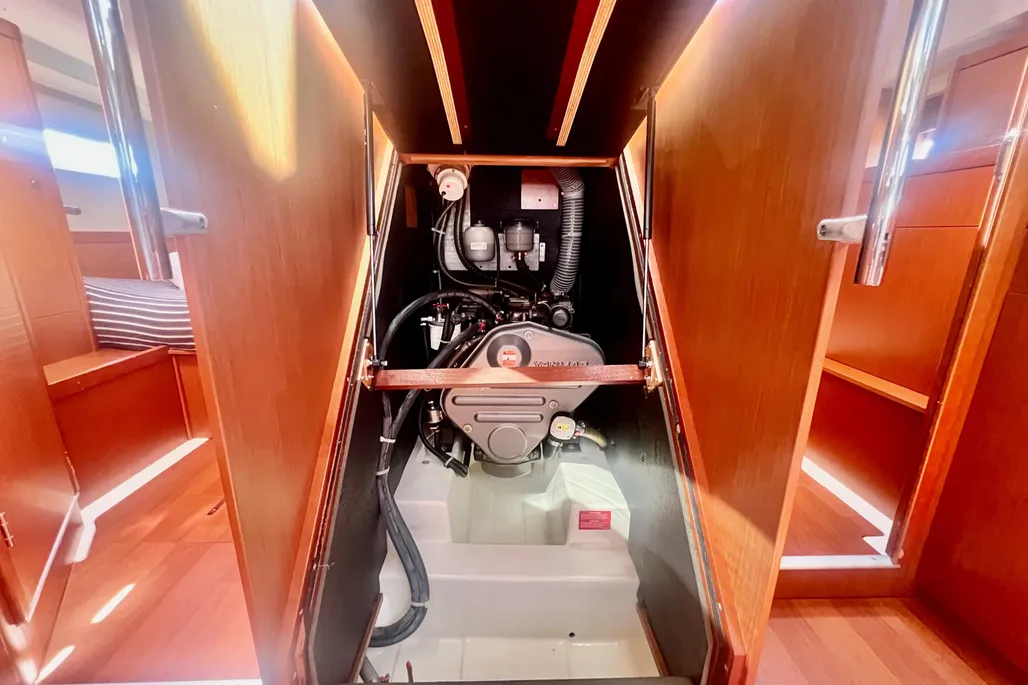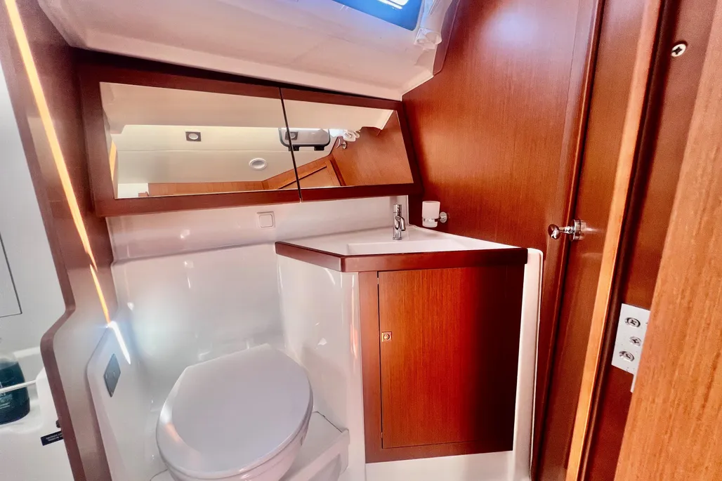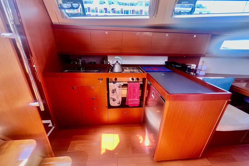 Under sail, the Oceanis 41 is a solid performer, registering upwind speeds in the mid-6s on a mild afternoon with the breeze in the low teens and knocking off a solid 8 knots when cracked off on a broad reach with a fully unfurled main and slightly overlapped jib set on a generous double-spreader, fractional, high-aspect rig. In puffier air, the furling main and jib were quickly and efficiently shortened to balance the sail plan. The Goiot wheels were light and responsive; the boat is a joy to drive.