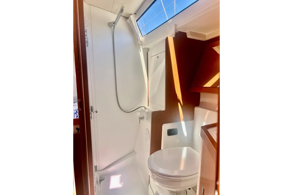 The signature fiberglass arch—a feature on many new Beneteau’s—and elevated mainsheet bridle does more than keep the mainsheet out of the way. It also serves as the backbone for a dodger or bimini. Halyards, control lines and reefing lines are logically clustered around rope clutches on either side of the companionway.